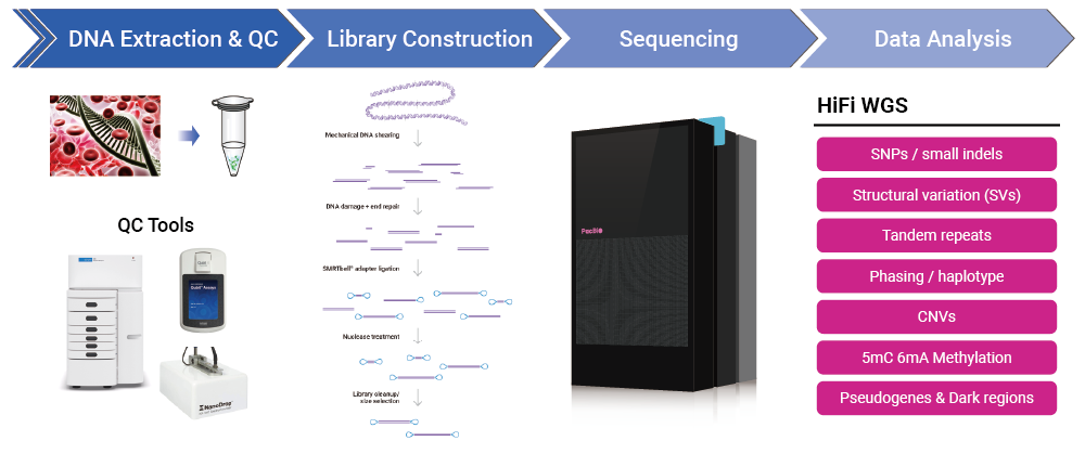 自血液 ( 或組織 ) 樣品萃取 HMW DNA 後,先將樣品 DNA 片段化至最適定序長度 (15~25kb),接著製成啞鈴狀模板 (SMRTbell) 文庫,將文庫進行片段篩選 (>10kb) 可以得到更好的長度產出,並於 PacBio Revio 平台進行定序與後續分析。
