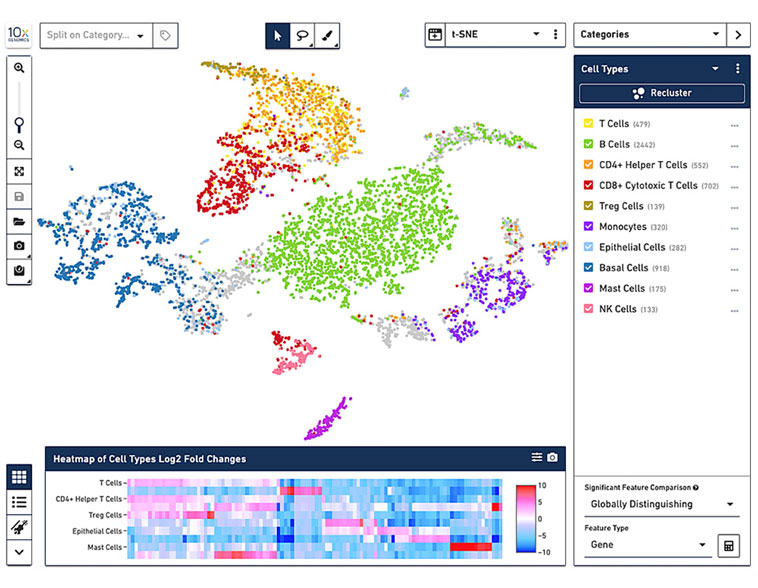透過 10x 單細胞定序分析軟體 Cell Ranger 與結果視覺化軟體 Loupe Browser,可依據各個細胞的基因表現狀況識別出不同基因表現的細胞群,也可彙整來自數個樣品基因表現類似的細胞群,同時可針對來自不同批次實驗的多個樣品進行合併分析。