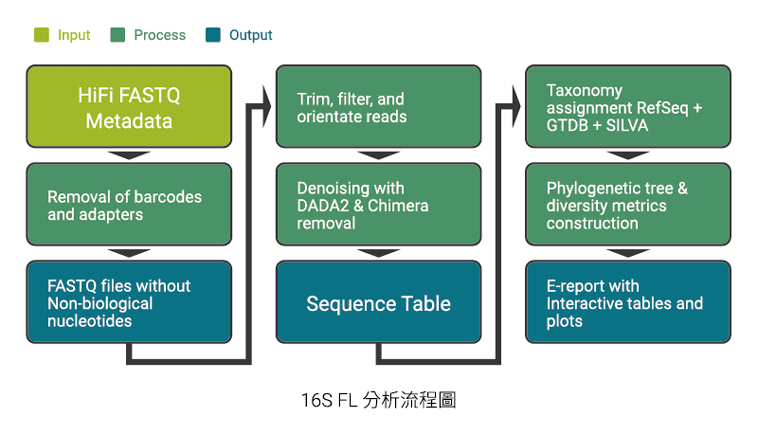 PacBio SMRTLink 被用於校正定序下機的原始數據並生成 CSS reads。Q 值達到 Q20 的 CCS reads 被定義為 HiFi reads。樣品拆分後,我們去除了序列中的樣品標籤和非生物鹼基的接合子 (adapter)。接著,我們根據序列的錯誤率和長度篩選掉低品質序列,並將保留之序列它們校正為一致的方向,然後運行 DADA2 演算法降噪,以獲得 ASVs (Amplicon Sequence Variants) 的特徵序列。