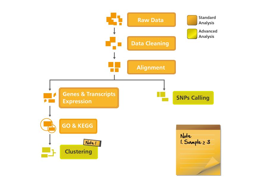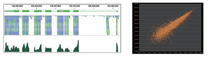 透過 NGS 技術將定序結果與參考文獻序列比對,進而獲得基因表現及功能註解,而更高的定序量及 Paired-End 定序方式可更準確深入探討到 transcripts 層級的基因表現 (Alternative Splicing),完整分析轉錄過程中所有基因表現的概況,另外除了這些已知的基因與 Transcripts 的資訊,亦可偵測到 Non-coding RNA ( 如 LincRNA ) 之表現狀態;除此之外,透過組裝的方式也可以進行 Novel Genes 或 Transcripts 的預測。NGS 在基因偵測敏感度略高於 Microarray,為目前基因表現分析最主流的實驗篩選工具。