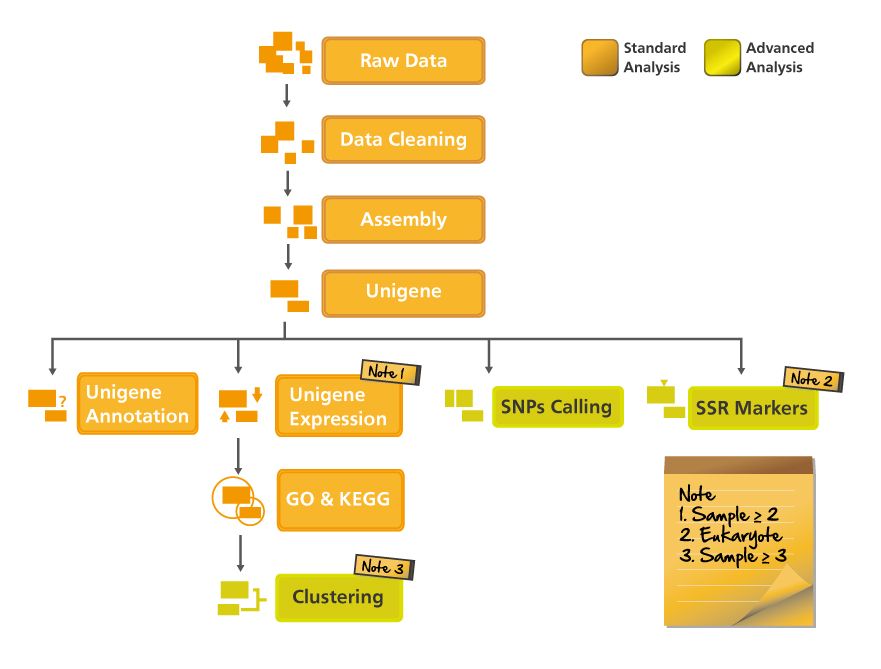 對於未知序列物種之 mRNA 進行定序及組裝,藉由組裝完成後之 Unigene 可進行基因表現及功能註解、分子途徑預測分析;另外針對 Unigene 亦可進行 SSR (Simple Sequence Repeat) 分析。因此透過次世代定序技術在非模式物種的研究可快速尋找且預測出有意義或表現差異的基因,並可搭配 Agilent 客製化晶片設計,做為快速篩選基因表現及驗證的實驗工具;藉由 NGS 技術探索非模式物種之基因表現及其 SSR Markers,在農林漁牧業的育種研究儼然已成為未來的趨勢。