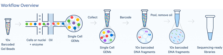 利用 10x Genomics GEM-X 技術,將單顆細胞與 Barcoded Gel Beads 進行油滴包覆,以獲得更高的細胞捕獲率和靈敏度。