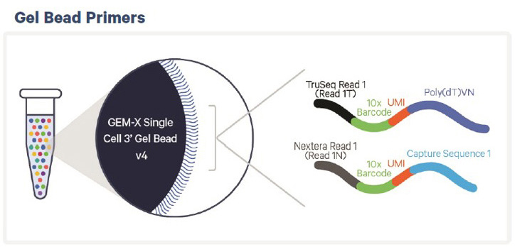 以 Barcoded Gel Beads 上特殊設計之條碼寡核苷酸序列,將每一個細胞內的 mRNA 標幟上細胞分子標籤。
