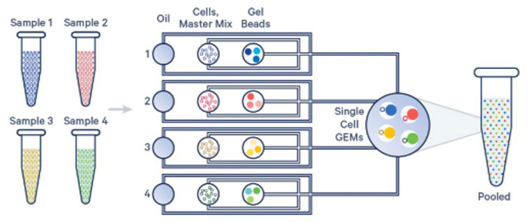 可搭配單細胞 On-Chip Multiplexing (OCM) 基因表現分析產品,在一次實驗中同時處理多個樣本(1~4個),可顯著提高效率並降低成本。該技術以四組各內含90萬個 Barcoded Gel Beads,來區分不同樣品,並合併於同一管 Single cell GEM (Gel bead in EMulsion) 進行操作。