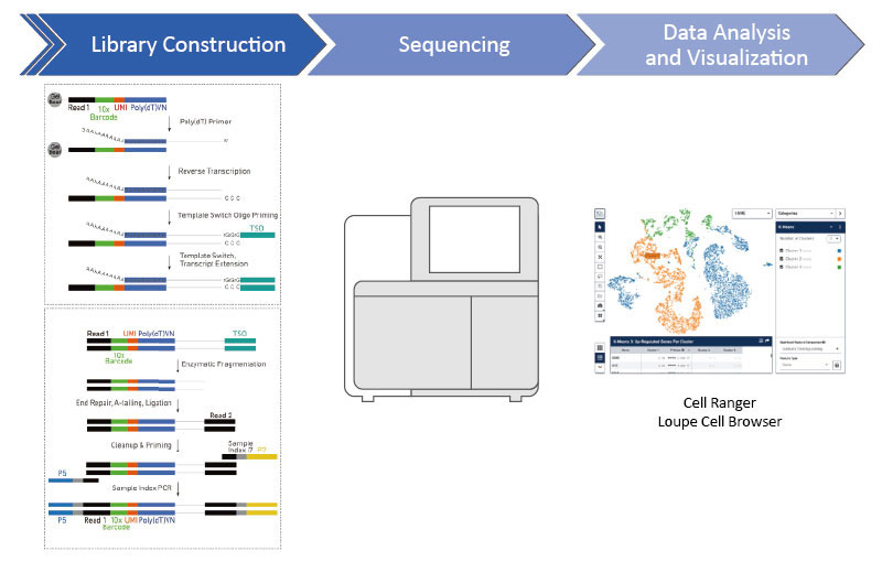 將已 Cell barcoded mRNA 進行建庫與定序,再以 Cell Ranger 軟體進行單細胞分群分析。